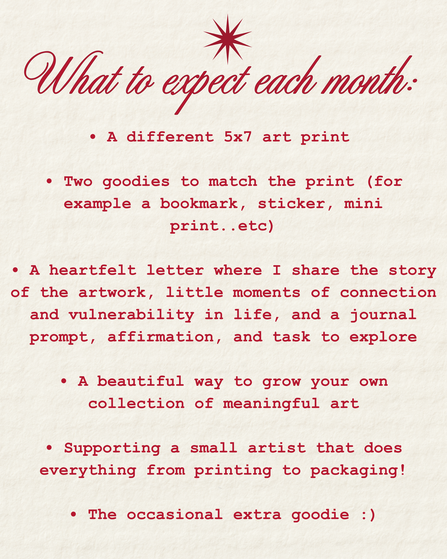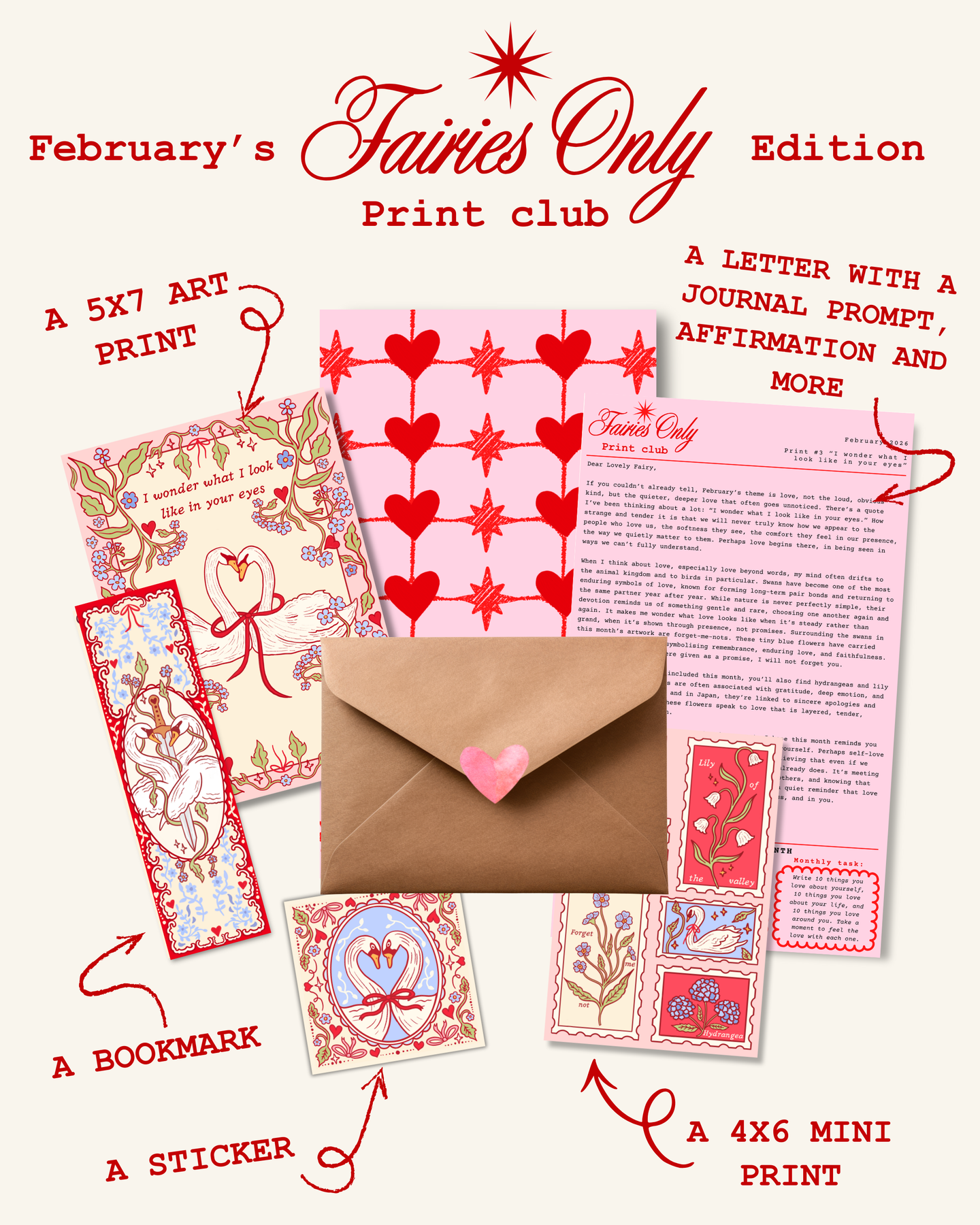 • A heartfelt letter where I share the story of the artwork, little moments from life, and a monthly prompt, affirmation, and task to explore